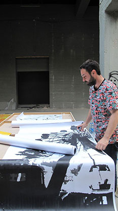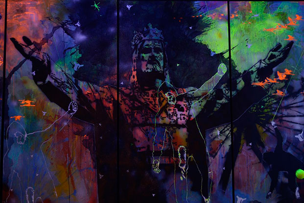 Jure Cvitan has once proclaimed himself to be the Conqueror of Unuseless. The colour palette – full of trashy, kitsch and neon colours – walks hand in hand with his typical iconography, a »Schnellkurs« in pop culture. His visual language is inspired by street art and stencil graffiti. The amusement park on the image is from Chernobyl – they were supposed to open it on the very day the nuclear reactor exploded. The post-apocalyptic atmosphere on his images is often accompanied with his self-portrait.